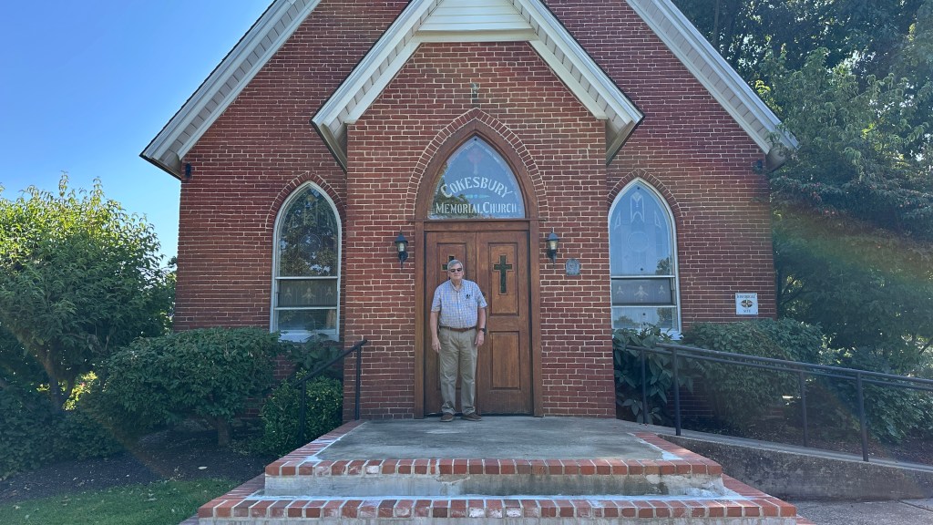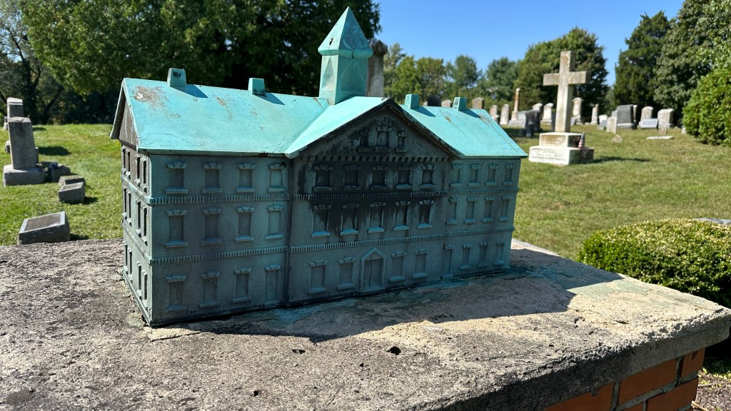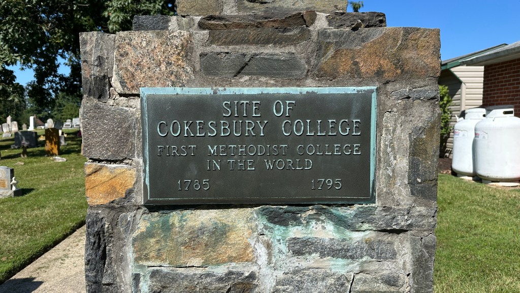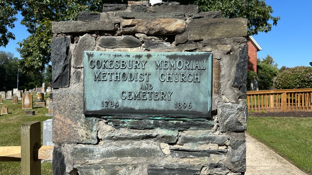 Friday, September 12, 2025: Our first stop after leaving Baltimore was the site of Cokesbury College. Francis Asbury and Thomas Coke founded the college in 1785, but it burned down in 1795. A chapel built after the school opened survived the fire and exists today as Cokesbury Memorial United Methodist Church. The area where the college sat was taken over by the church and is now part of their cemetery. There are four corner markers within the headstones that denote the four corners of the college. I paced off the distances and came up with a building that was 120’ x 48’. The fire was most likely arson. Bonnie (who we met at the Lovely Lane museum) wrote her undergrad thesis on Who Burned Cokesbury College? – her conclusion is that it was James O’Kelly, who led an early schism in the American Methodist Church who burned the college. Photos above show a plaque noting the college, one of the corner stones and a bronze model of what the college looked like (first row). In the second row are photos of the church and its plaque. We weren’t able to see the inside of the church, but there were two groundkeepers there that were mowing the well-kept cemetery. One of them was a member of Cokesbury Memorial, but admitted to having become a lax member. I gave them a Prologue and invited both to attend church this Sunday.
