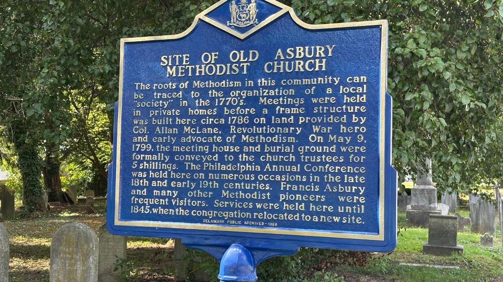 We traveled through Cecil County, MD, crossed into Delaware and stopped at Smyrna, DE to visit Asbury UMC. Asbury held a conference in Smyrna on May 10, 1791, where he ordained two elders and three deacons. I suspected that Asbury church was closely connected with that 1791 conference. No one came to the door, the office phone rang and rang when I called it, only to be routed to voicemail. I was looking through windows out front and realized there was a courtyard in the middle of the structure and I could see people moving around in the part of the building on the other side of the courtyard. We found a way around back to their main parking area and interrupted a group of folks who were busy setting up their weekly food pantry. The first person who greeted us was Susan. Let me tell you… Susan is a go-getter. I explained who we were and that I suspected Asbury Church was a descendant church of Methodism at Smyrna at the time Asbury held conference there. Susan nodded her head and corrected me… Asbury Church was THE church where that conference was held… in their original church building across the road from their parking lot (the space is now a cemetery for the church). Susan gave us a tour, and copied many pages from an extensive history of Asbury UMC for me to take. It affirms that Asbury held conference there in 1791. An historical marker stands at the corner of the lot where the original building stood.