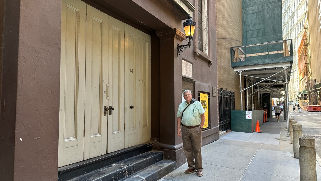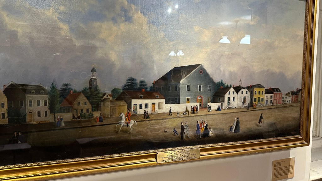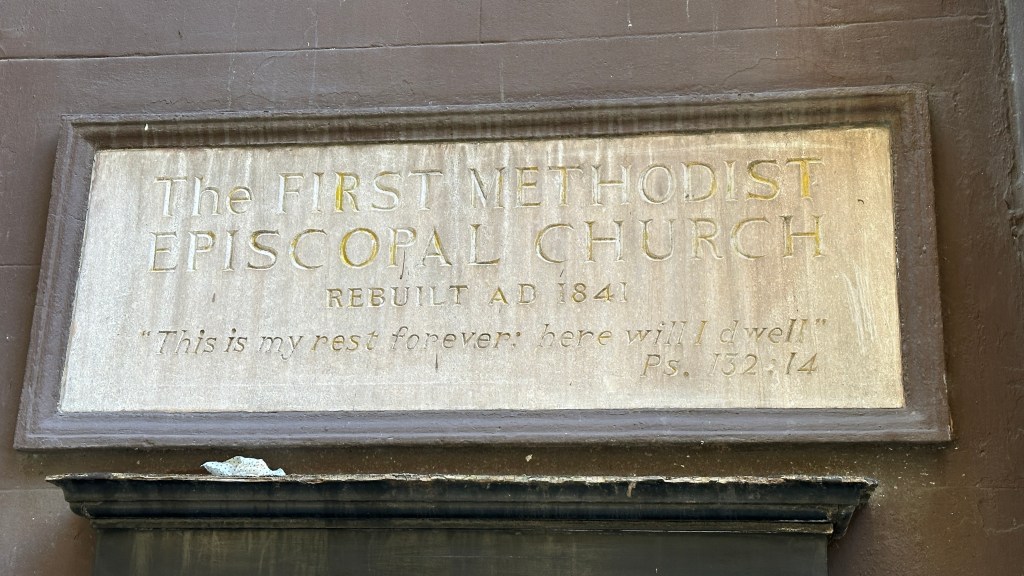 After riding the Path train from Jersey City (which goes under the Hudson River), we walked the few blocks to John Street UMC. In his early time in America, John Street, along with St. George’s in Philadelphia became “home turf” for him – frequently traveling between the two locations. In 1791, he was here to conduct a conference.Pastor Stefanie arrived and let us into this place of Methodist history. In the photos above: note the stark contrast of the church in relation to the towering buildings that contain it. Stefanie told us that the land on which the church stands has a special ecclesial classification that prevents its use for any other purposes. All the surrounding land is designated as business.