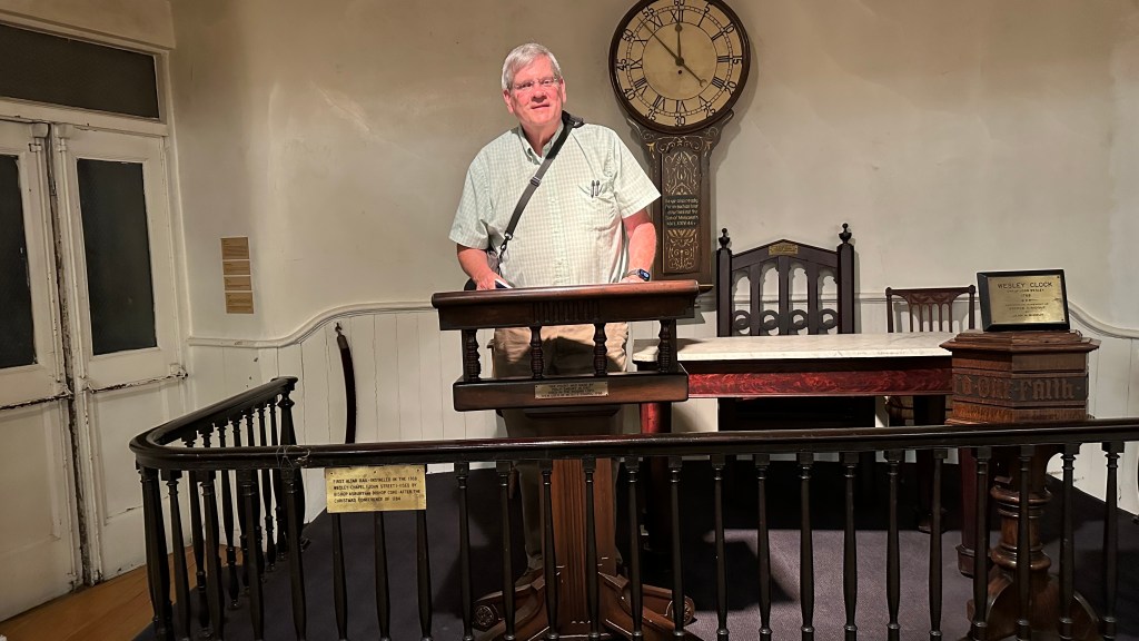 I’m standing behind the pulpit used by Phillip Embury (the founder of what would become John Street Church) and according to Pastor Stefanie would have surely been used by Asbury while here. The interesting circular benches were used in the class meetings. The chalices are the original ones used at John Street for communion. It was after the Christmas Conference in 1784 that Methodist preachers were first ordained, which then allowed them to preside at the sacraments. In the first photo, is a section of the original rail purchased soon after that conference to facilitate communion at John Street, Stephanie told us that it was the only way anyone knew how to celebrate communion – it was purchased in a rush.