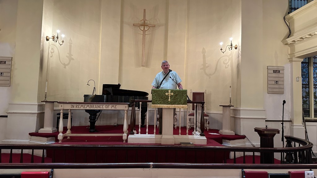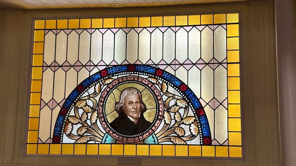 This is the sanctuary of John Street… and of course Francis Asbury never saw this sanctuary. The stained glass window depicting Asbury is at the back of the sanctuary… Pastor Stefanie told me she feels that each Sunday morning she is preaching in the presence of Francis Asbury.